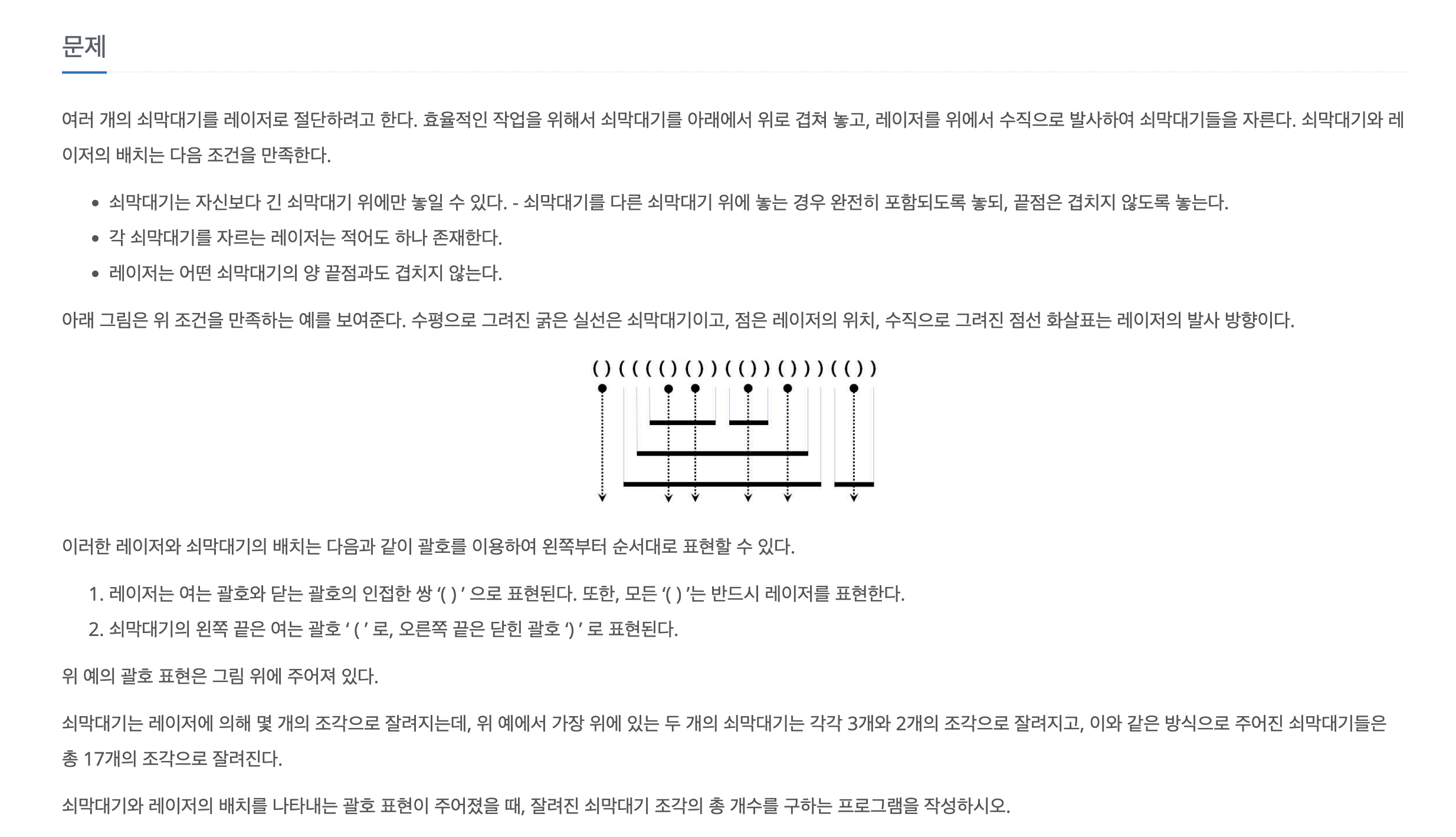 - () 이런식으로 연속된 가로로 있는 경우, 이것이 레이저이다. 이때 이 연속된 가로를 제거 후 해당 stack의 길이(나무토막의 길이)만큼 count에 추가해 주면 된다