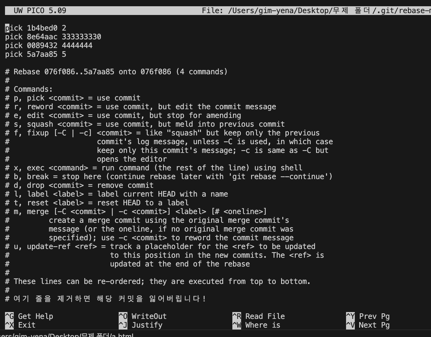 4. 커밋 메시지를 바꾸고 다시 ctrl + o 누르고 enter 다음 ctrl + x 입력!