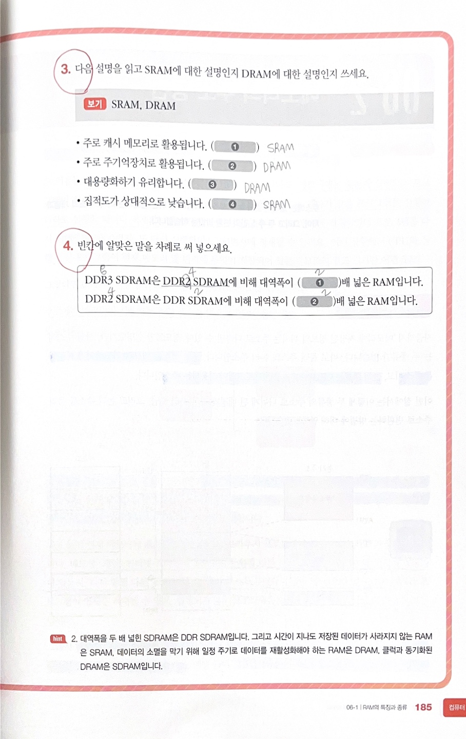 - 2DDR SDRAM(4)는 DDR SDRAM(2)보다 대역폭이 2배 넓음