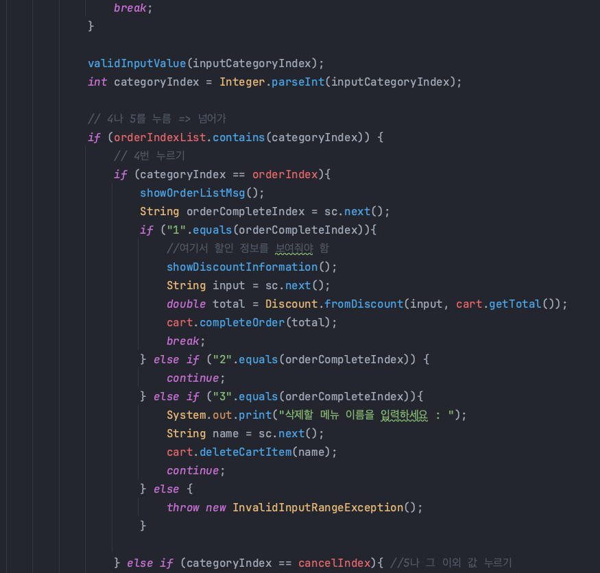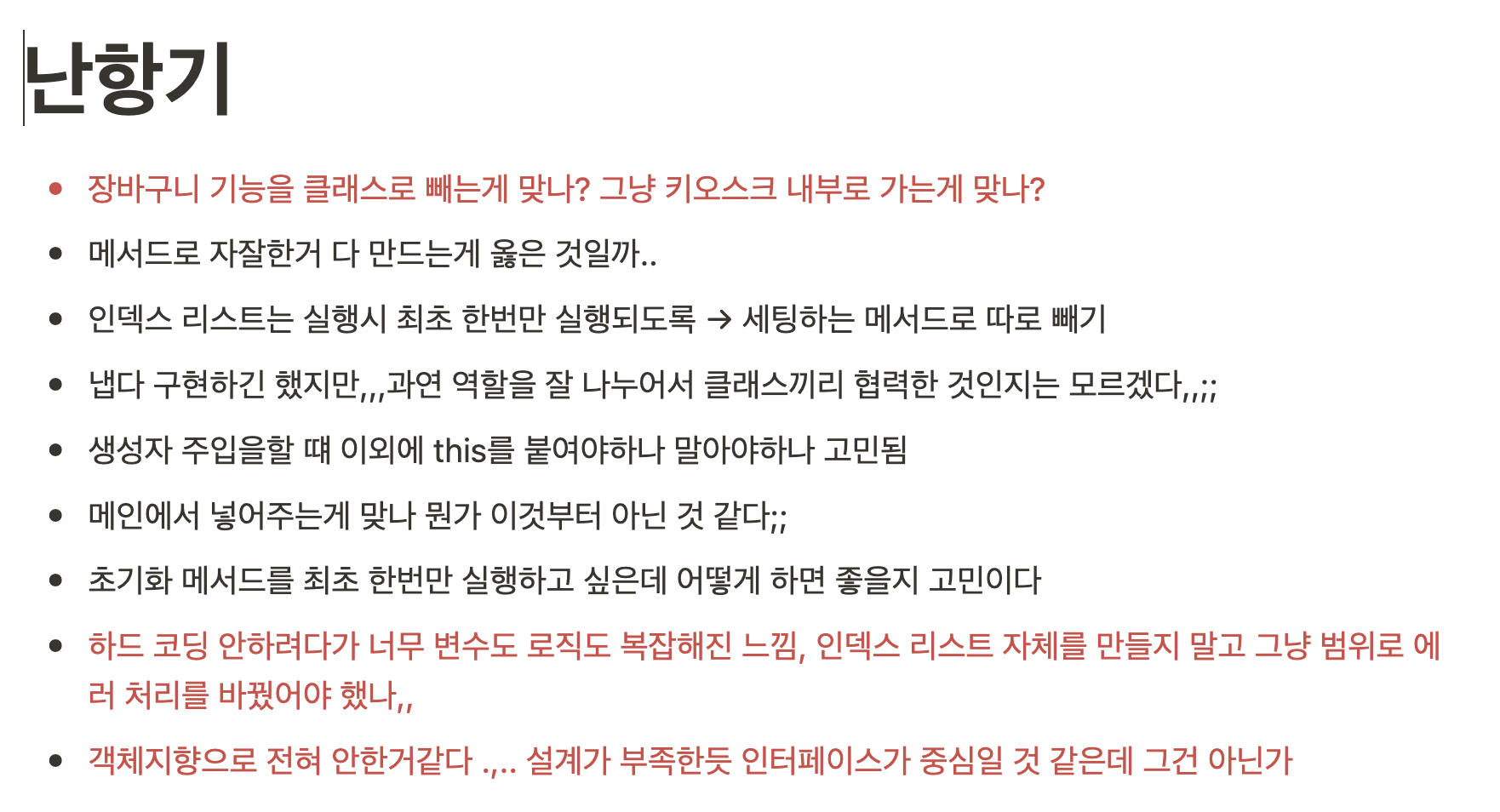 - 장바구니기능이 없는 lv5만 구현했을 때까지만 하더라도 Kiosk 클래스는 사용자의 주문에 대한 입출력에 대해서 기능적인 부담이 크지 않다고 생각