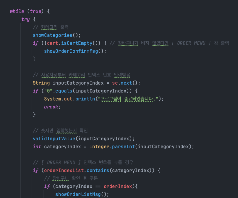 - menuItems의 리스트 인덱스를 생성을 딱 한번만 하기 위해서 어떤 식으로 할지 고민하다가 showMenuItems 메서드를 실행할 때 리스트 인덱스가 비어있으면 생성하고, 비어있지 않다면 생성하지 않는 식으로 구현