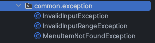 - MenuItemNotFoundException : 메뉴를 삭제할 때, 장바구니 리스트에 없는 이름을 입력한 경우 발생하는 예외 객체