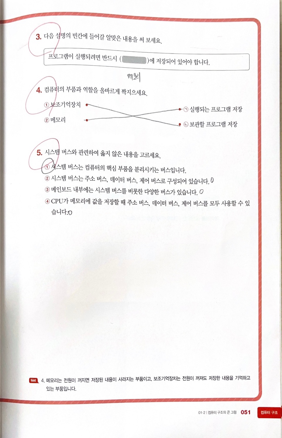 - 보조기억장치 : '보관할' 프로그램과 정보를 저장, 전원이 꺼져도 저장된 내용이 날아가지 않음