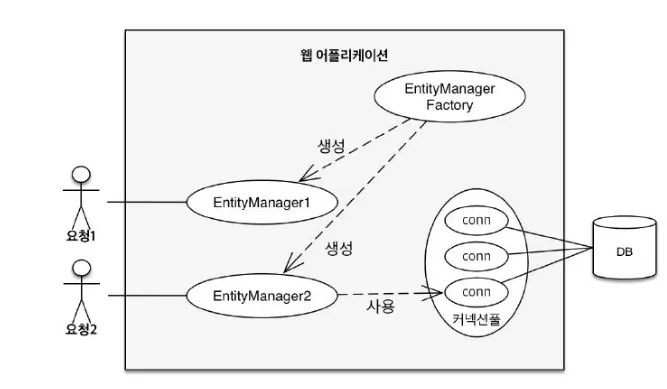 - 엔티티 매니저 팩토리를 통해 요청이 올 때마다 엔티티 매니저 생성