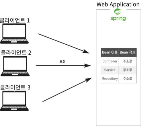 스프링 빈을 싱글톤 패턴으로 적용하지 않으면, 다수의 고객이 요청할 때마다 생성하고 소멸되기 때문에 메모리 낭비
